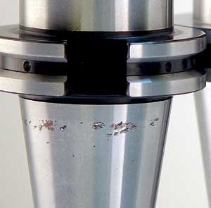 2. Check spindle’s run-out every six months and/or after any crash using a calibrated spindle test bar. Also, monitor the spindle’s drawbar spring force with a pull force test. Pull force should be at least 80% of the designed value and a sizable drop in force could lead to excessive vibration and run-out, which can damage the spindle and tool holder. Fretting corrosion can appear on the taper and the finished part’s surface.